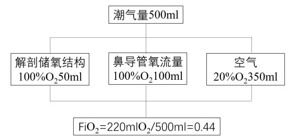 解釋:潮氣量指平靜呼吸時每次吸入或呼出的氣量,假設的情況為吸氣時間1秒,因此這1秒內吸入的氣體量為500mL。在呼氣末會暫停0.5秒,這0.5秒內沒有呼吸動作,鼻導管會將解剖儲氧結構內的空氣排走,使得50mL的解剖儲氧結構內為100%的純氧,在下次吸氣時會被吸入。鼻導管在吸氣的1秒內提供100mL純氧(6L/min的氧流量,即100mL/s),這樣吸氣時已經吸入了150mL的純氧,而潮氣量是500mL,剩下的350mL即為空氣,空氣的氧含量為21%,這里為了便于計算,簡化為20%,350mL的空氣中氧氣為70mL,FiO2=吸入的氧氣體積/吸入總氣體體積=220mL/500mL=44%。而根據鼻導管的FiO2估算公式:FiO2=21%+4×氧流量%=21%+4×6%=45%。估算值和實際值是非常接近的。在這樣的假設條件下,若潮氣量為xmL(x>150mL),則FiO2=0.2+120/x,x越高,則FiO2越低。