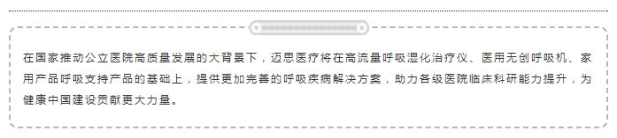 邁思醫療HUMID-BH?高流量呼吸濕化治療儀提供連續穩定可調節濃度的高流量空氣氧合混合氣體,并對該混合氣體進行準確的溫度和濕度控制,從而對呼吸衰竭患者提供有效的呼吸支持并保證氣道纖毛轉運系統處于良好狀態。