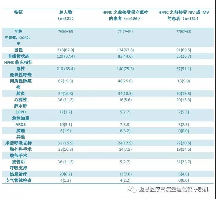 我們從22家醫(yī) 院收集到了321名接受經(jīng)鼻高流量氧療的患者信息(中位年齡為76歲; 218名男性,103名女性; PaO2 / FiO2的中位數(shù)估計(jì)為178mmHg)。其中37.4%的患者不需要插管。在HFNC之前,57.9%的患者接受了常規(guī)氧療; 25.9%的患者接受無創(chuàng)通氣; 同時(shí)有15.0%的患者接受有創(chuàng)機(jī)械通氣。HFNC的常見適應(yīng)癥為急性低氧性呼吸衰竭(ARF)(65.4%),術(shù)后呼吸支持(15.9%)和拔管后呼吸支持(11.2%)。急性呼吸衰竭(ARF)的病因包括間質(zhì)性肺病,肺炎和心源性肺水腫。 HFNC的應(yīng)用場(chǎng)所主要在重癥監(jiān)護(hù)室或亞重癥監(jiān)護(hù)病房(60.7%)和普通病房(36.1%)中進(jìn)行。HFNC應(yīng)用時(shí)間的中位數(shù)為4天; 設(shè)置流速的中位數(shù)為40L / min;FiO2的中位數(shù)為50%。與基線水平相比,HFNC顯著改善患者的PaO2,PaCO2,SpO2和呼吸頻率等。三分之二的患者病情好轉(zhuǎn)。