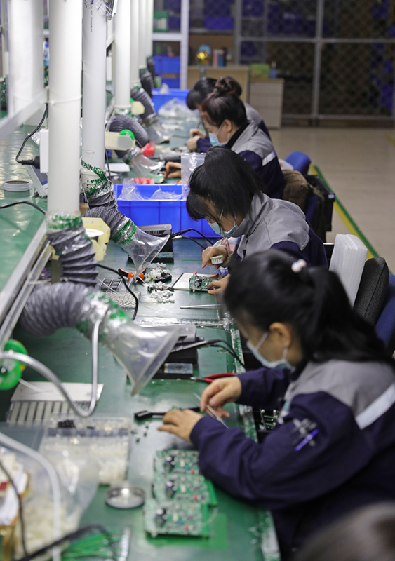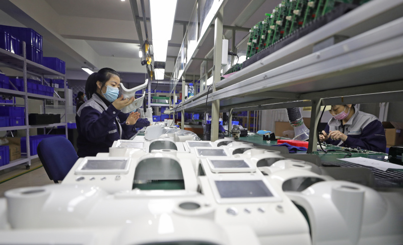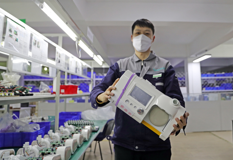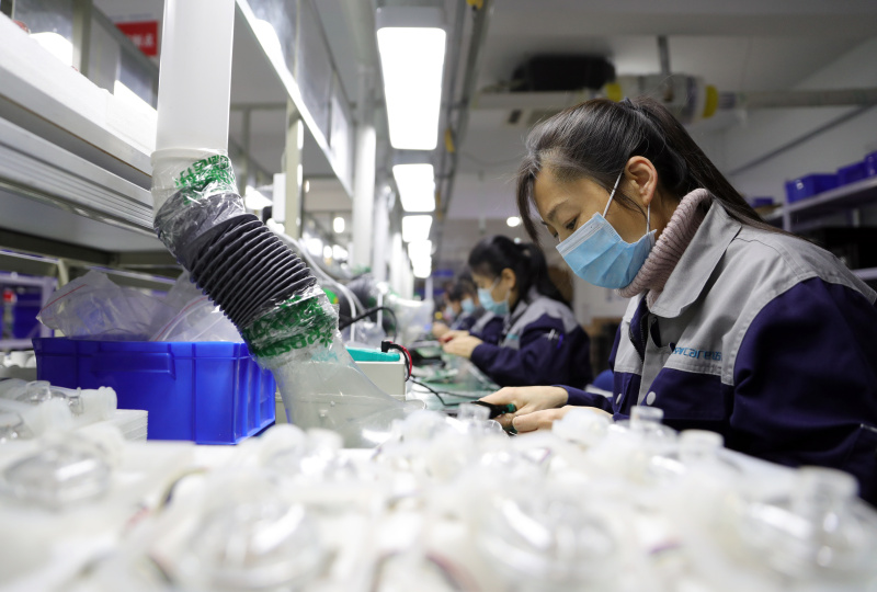 1月31日,沈陽邁思醫療科技有限公司員工在車間生產無創呼吸機。